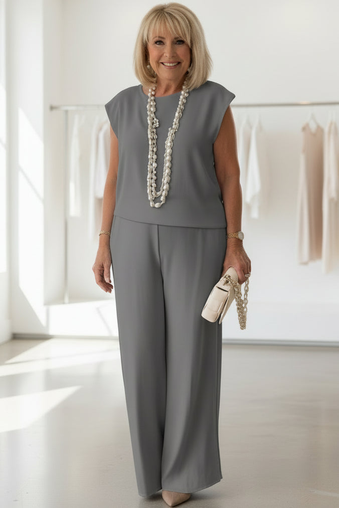 Details: Sleeveless top, tailored trousers, minimalist finish